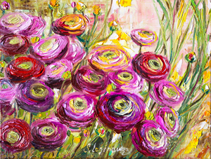 Яркая картина на холсте маслом с ранункулюсами. Цветы получились очень сочные, написаны толстеньким слоем масла в популярной пастозной технике мастихином.