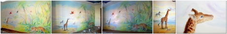 Стояла задача совместить саванну с джунглями, визуально расширив пространство, изобразить животных реалистично, но добрыми.