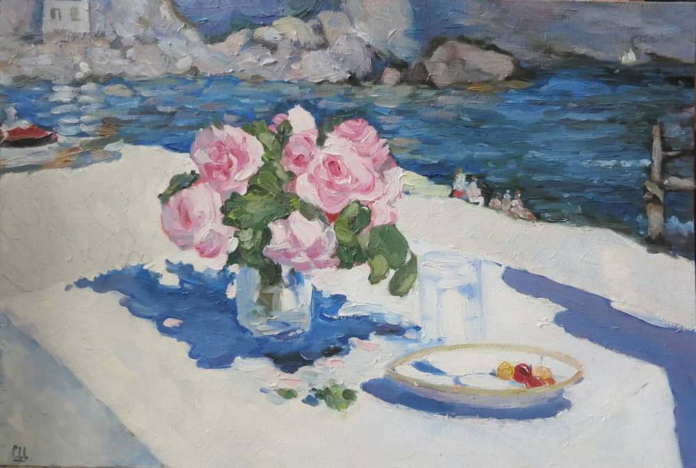 Картины первого русского импрессиониста Константина Алексеевича Коровина не могут оставить равнодушным ни одного любителя живописи: крупные экспрессивные мазки, гармоничная палитра, виды солнечного юга. Сложно не поддаться искушению освоить его чудесную манеру живописи. Данная картина, помимо всего прочего, представляет собой любопытное сочетание прекрасного натюрморта с розами и оригинального крымского пейзажа.
