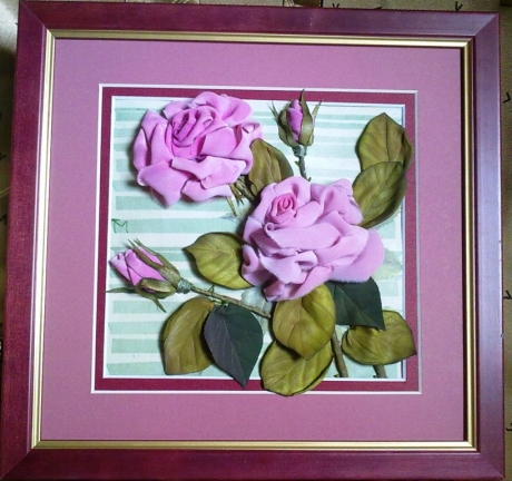 Лен, салфетка, ленты самодельные (иск. шелк) и атласные, нитки мулине, акрил, мононить. Листья из атласных лент и ткани из иск. шелка, сделаны отдельно и прошиты сквозь основу.