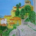 На картине изображен старинный городок Сан-Лео, расположенный в холмах недалеко от курорта Римини (Италия).Вы видите каменную мостовую, церковь на вершине холма, яркие желтые домики и синие холмы вдали. Картина передает ощущение спокойствия и тишины.