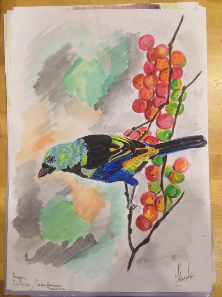 Семицветная танагра на ветке с ягодами. На картине есть не большой дефект, если вставить в рамку, он не виден.