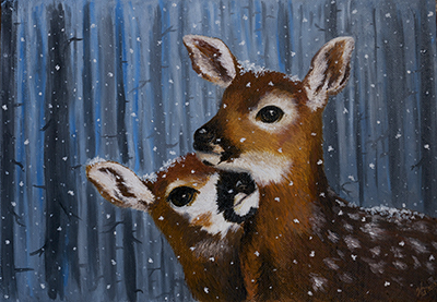 Картина выполнена по фотографиям, оформлена в деревянный багет, покрыта защитным лаком. Когда смотришь на этих оленят, кажется, что они следят за тобой глазами и вот-вот зашевелятся!