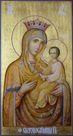 Икона СКОРОПОСЛУШНИЦА Б.М. является точной копией списка с чудотворной афонской иконы. Написана на липовой доске, использовано сусальное золото, натуральная темпера, масляные краски. Являет собой редчайший образец иконописи 19 века.