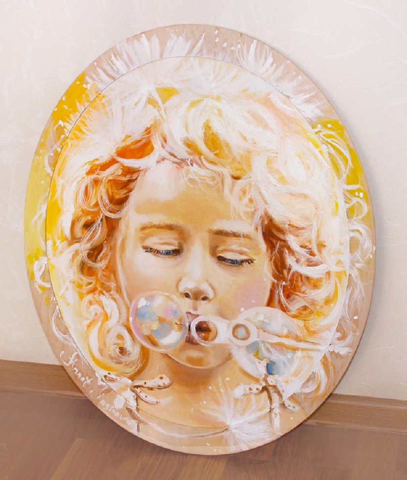 Картина выполнена маслом на холсте с круглой деревянной рамой.