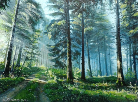 реализм пейзаж лес солнце лучи тропинка сосны ели