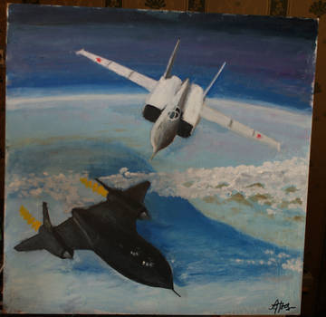 Картина изображает эпизод холодной войны - высотный перехватчик СССР перехватывает на высоте 25 км (стратосфера, поэтому небо-темно-фиолетовое до черного американский скоростной самолет разведчик над нейтральными водами (20 миль от берега) в районе Камчатки (сквозь облака видны сопки), возможна пересылка по РФ + 500 к цене