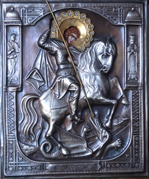 Св. Георгий Победоносец в посеребренном окладе с позолоченным венцом.