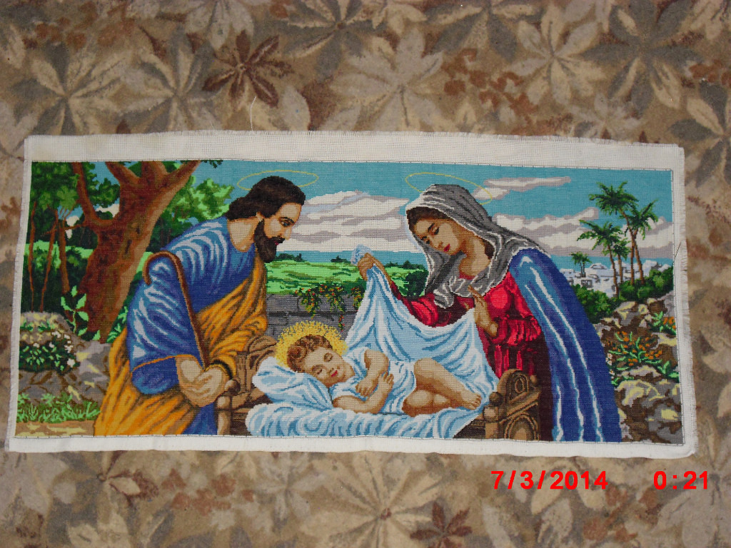Картинка из Библии. Очень яркая и красивая. Вышитая мелким крестиком. Вся картина полностью зашита.