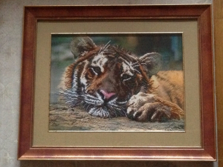Вышитый бисером тигр, очень красивый и реалистичный. Картина оформлена в багет под стекло.