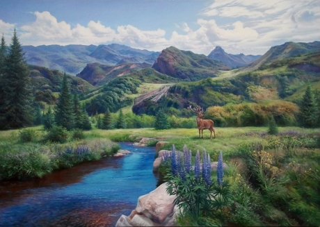 Авторская работа, с непередаваемым для фото ощущением простора долины горного пейзажа, чистого воздуха и свежести красок. В средине картины находится олень, вышедший к реке, как символ покоя и удивительного мира величия первозданной красоты природы.