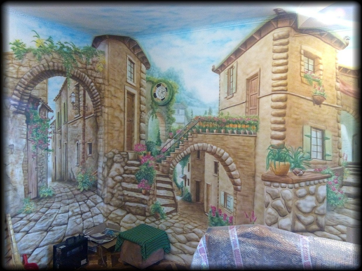 Роспись по штукатурке в кухне. Панорама на трех стенах. Пришлось расписать и корпус кондиционера, чтобы не разбивал рисунок.