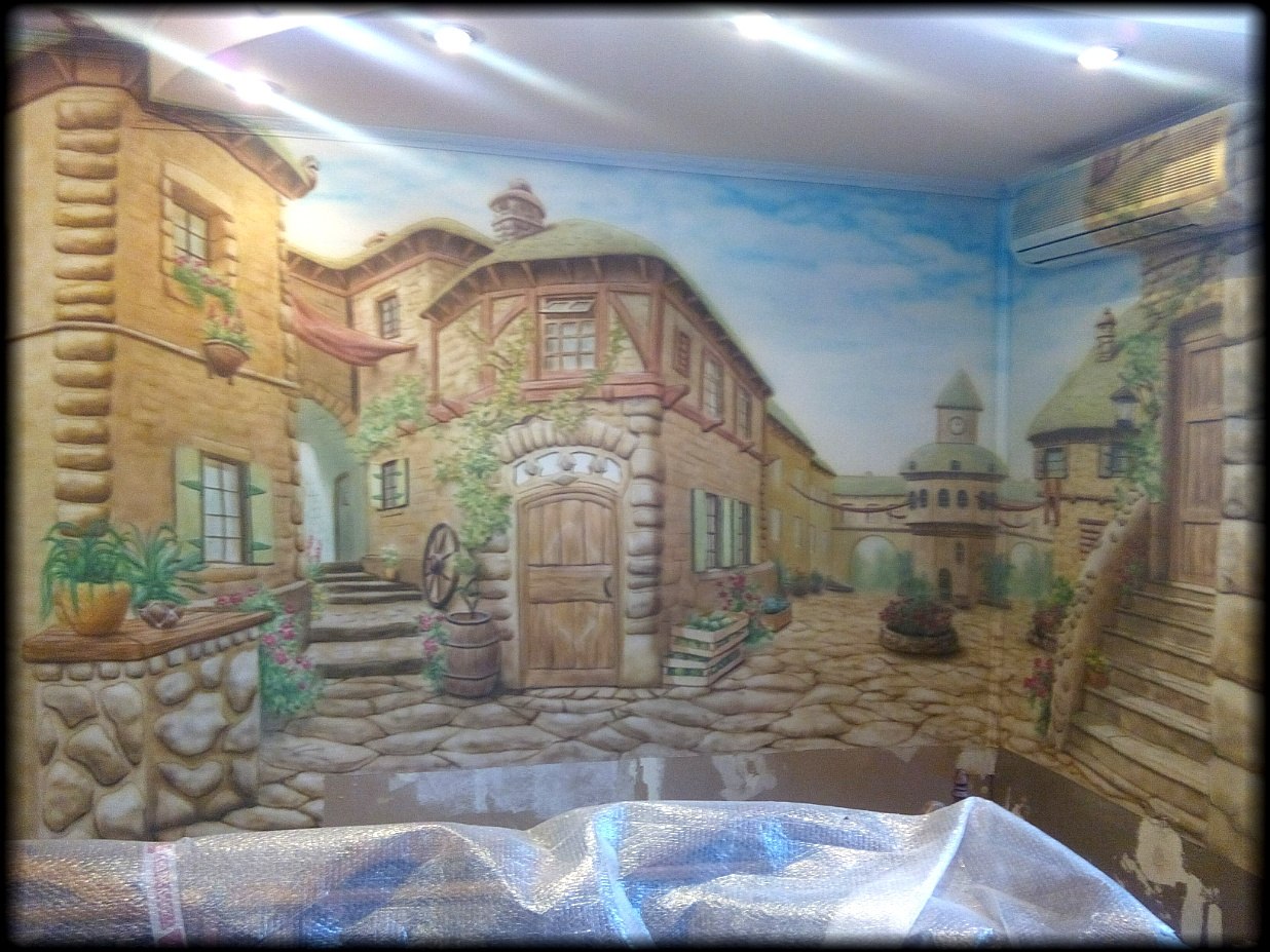 Роспись стен в интерьере кухни. Пришлось расписать корпус кондиционера, дабы не разбивал рисунок.