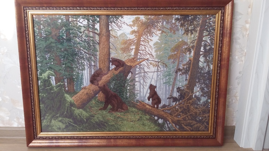 Продается картина вышитая крестиком - "Утро в сосновом лесу". Размер картины (без рамки) 78*53 см. Картина оформлена в багетной мастерской в деревянную рамку.
