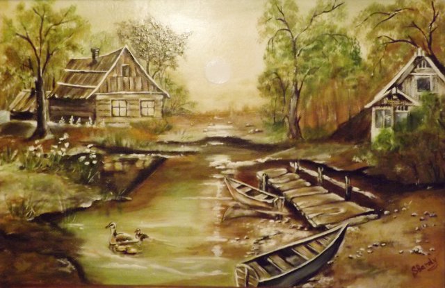 Картина написана акрилом на ДВП. Рамка деревянная.