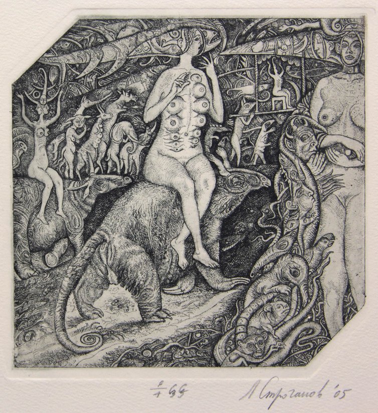 Офорт (C3). Акватинта (C5). Авторская ручная печать (E/A). Размер оттиска: 12.5х12.5 см. Размер бумаги: 21x24 см