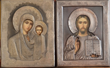 Иконы Спасителя и Казанской Божьей Матери написаны масляными красками в академической реалистической манере. Оклады посеребренные 960 проба - ручной работы!