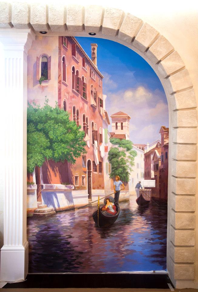 Роспись стены в интерьере квартиры. Прекрасный пейзаж солнечной Венеции. Выполнен в уникальной технике матовыми масляными красками на стене. Реализм и мастерство исполнения деталей позволят насладиться живописью с близкого расстояния.