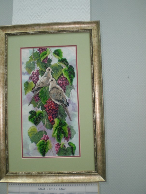 Картина выполнена в смешанной технике (счетный крест+бисер). Символична как по названию так и по содержанию: вышитая пара горлиц на виноградной лозе. Станет хорошим подарком на свадьбу, юбилей. Украсит интерьер, придав ему особое очарование.