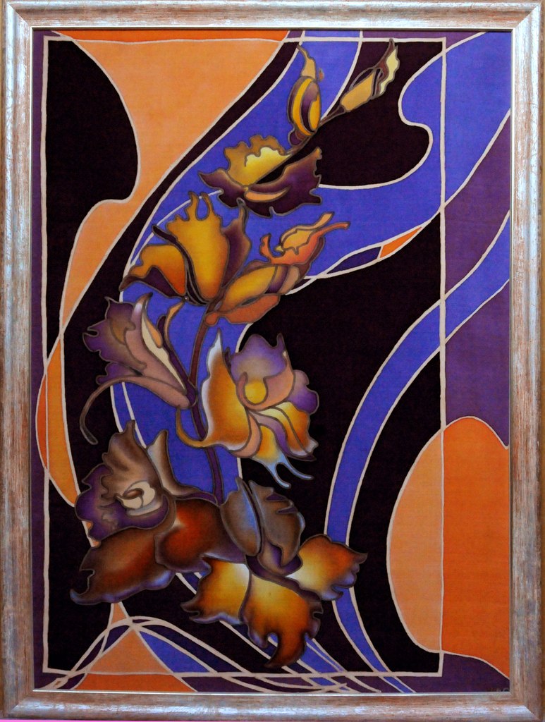 Работа сделана в технике холодный батик. В качестве материалов использовался парашютный шелк и парозакрепляемые красители. Панно размером А2. Оформлено соответствующей по цвету рамкой. Работа украсит собой любое помещение, идеально подойдет в подарок.