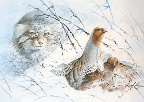 Кот Манул и серые куропатки.
