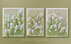 Чудесный триптих из трех объемных картин на шелке: трехслойные. Нижний слой- плотный шелк с абстрактным рисунком, второй слой- сетка с искрами, верхний слой-прозрачный шелк с нежными белыми ирисами.