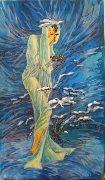 Времана года. Идея взята с работ художника А. Мухи. Смешения техник холодного и гарячего батика + контур.
