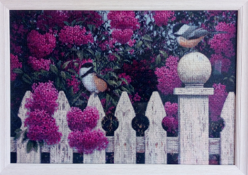 "Сирень". Канва, мулине; 64х46 см (с рамой). 53 цвета, 117 600 крестиков. Рама и оформление - багетная мастерская.