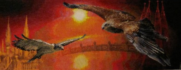 Яркая вышивка с орлами "Два неба" дизайна Panna. Размер вышивки без учета багета 56 на 21 см с использованием 44 цветов. Картина оформлена в двойной багет.
