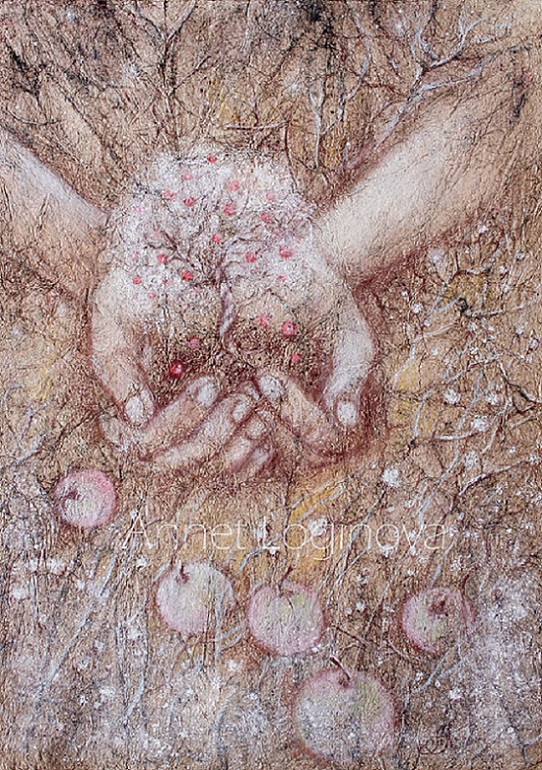 Картина выполнена пастелью на природной бумаге ручной работы с красивой складчатой текстурой, теплой и бархатистой, напоминающую кору дерева (от мастера Aksalk).