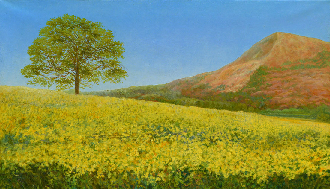 Рапсовое поле с деревом возле небольшой горы. Умиротворяющий просторный вид под умеренным полуденным солнцем.