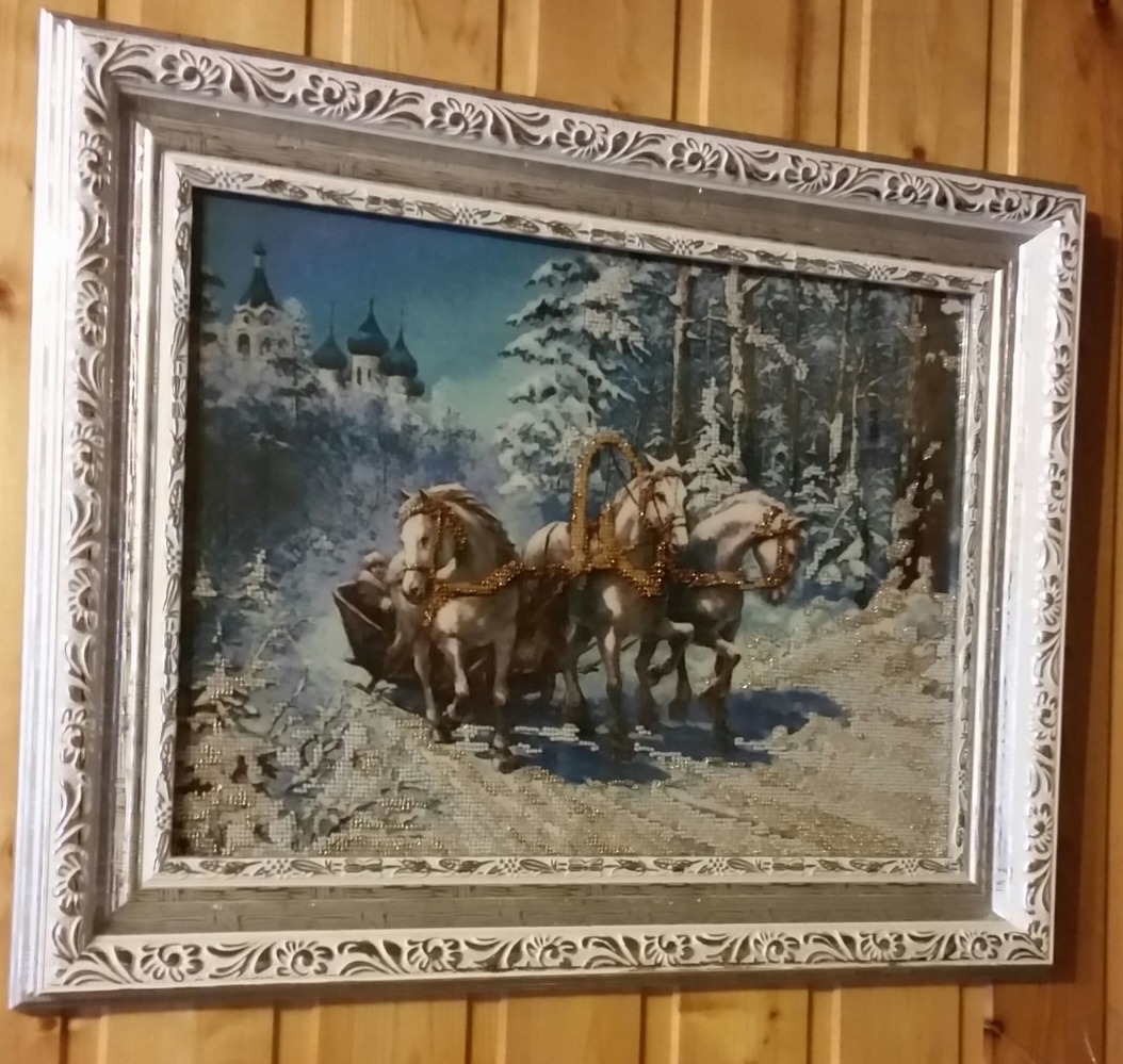 Картина выполнена в технике вышивание бисером, частичная вышивка. Оформлена в багет под стекло.