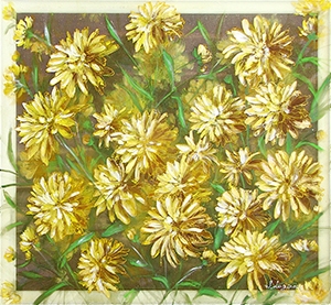трехслойная картина на шелке. Верхний слой-натуральный шелк прозрачный газ с изображением цветов, нижележащий слой- сетка с искорками, и самый нижний слой- шелк с изображением цветов. Картину можно мыть.